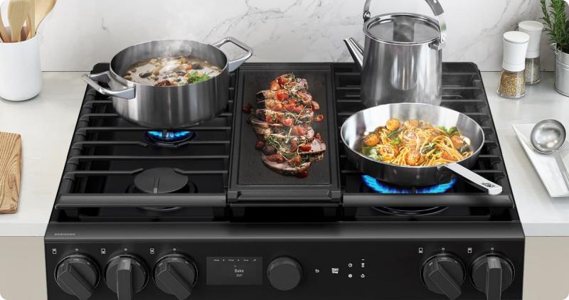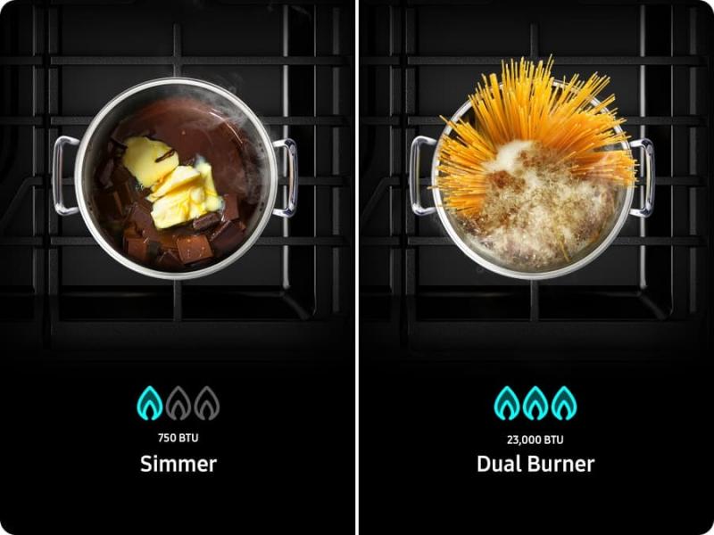 Make meals in a snap with a range with Samsung's most powerful gas burner.* This 23K BTU Dual Ring Brass Power Burner boils water quickly and is ideal for searing meat and stir frying. It can also turn down to a true simmer for melting chocolate or making sauces.