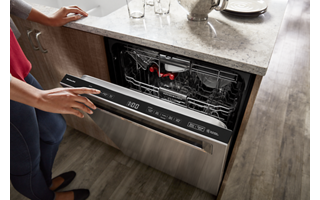 provides quiet cleaning without compromising performance, so there’s no need to wait to run a wash cycle while entertaining and enjoying meals, even in open concept kitchens.