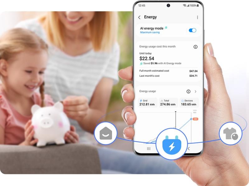 * Available on Android and iOS devices. A Wi-Fi connection and a Samsung account are required. ** SmartThings Energy currently works with around 40 Samsung home appliances that are SmartThings enabled. These include washing machines, clothes dryers, dish washers, air conditioners, air purifiers, vacuum cleaners, ovens, hoods, cooktops, microwave, TVs (from June 2022) and energy meters.