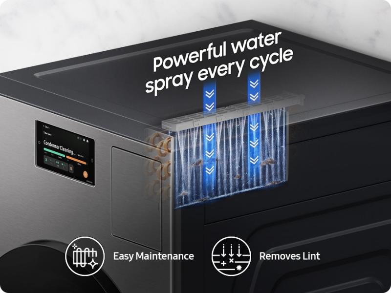 The Auto Condenser Cleaning system keeps the heat condenser clean. The Auto Condenser Cleaning powerful water nozzle sprays the heat exchanger with water just before the drying cycle ends. It removes the lint and dirt that normally accumulates over time, which leads to less effective drying.