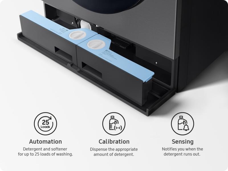Automatically dispense up to 47 loads of detergent or flex one compartment to dispense up to 34 loads of softener and 25 loads of detergent with the Flex Auto Dispense System.