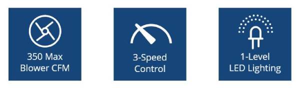 The 350 Max Blower CFM has a 3-speed push button control and operates at 1 sone at normal speed.