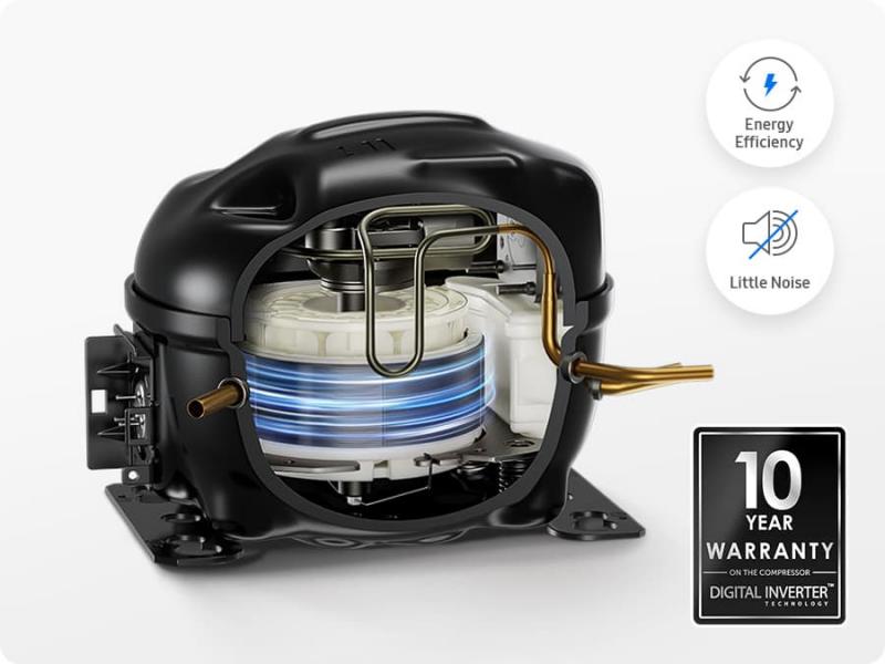 * Based on internal testing compared to conventional M0 Samsung compressors. ** 10 year warranty is limited to the compressor.