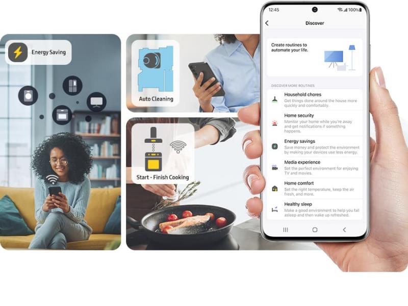 * Available on Android and iOS devices. A Wi-Fi connection and a Samsung account are required. ** SmartThings Energy currently works with around 40 Samsung home appliances that are SmartThings enabled. These include refrigerators, washing machines, clothes dryers, dish washers, vacuum cleaners, ovens, hoods, cooktops, microwave ovens, and TVs (from June 2022).
