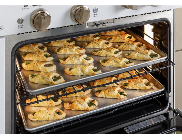A large 6.2 cu ft. capacity oven fits a full-size catering pan and has three racks, a Gas Bake, and a Dual Power Broil system for even heating.