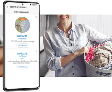 * Available on Android and iOS devices. A Wi-Fi connection and a Samsung account are required. ** Stores user data, preferences, and usage patterns to provide the most useful options. *** The user will be solely responsible for any consequences that may arise, including, but not limited to, any damage or injury caused by incorrect information provided by the user. **** The recommended wash cycle is based solely on time and may not be appropriate depending on the fabric of the items being washed. ***** A Wi-Fi connection is required at all times, which may increase energy consumption.