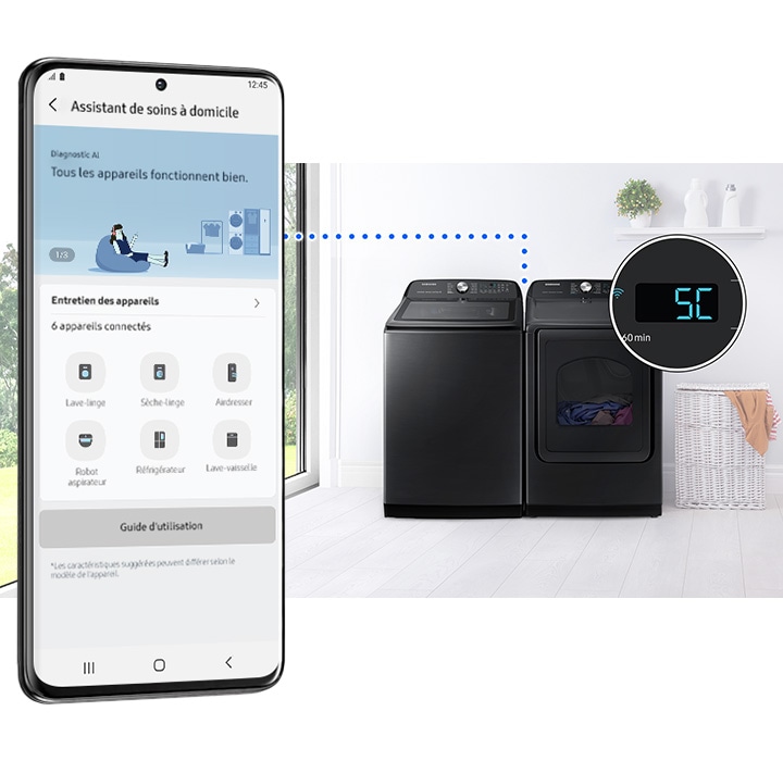 Use your dryer more easily and efficiently with the SmartThings app*. Laundry Recipe recommends the best drying cycle***. Laundry Planner optimizes your daily schedule****. A HomeCare Assistant helps with troubleshooting. And Auto Cycle Link***** selects an optimal drying cycle after a wash.