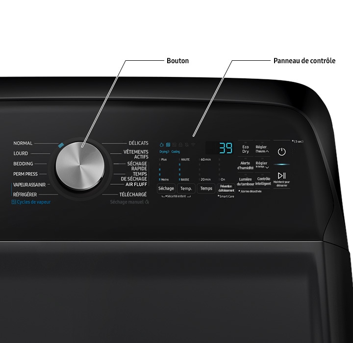 Moisture alert, Anti-crease, Smart control, Time setting (High), Time setting (Low), Child lock (double touch), Sound off (long press), Eco Dry, Smart Care (long press), Drum light, Smart Control