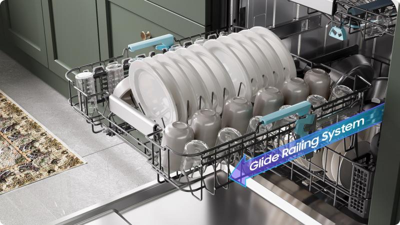 Remove safety call-out: Pull out a basket full of dishes easily. The Glide Railing system creates less friction, so the middle rack slides in and out smoothly. You can load or unload a basket full of dishes with hardly any effort, even if it contains heavy pans, and it reduces the risk of items falling out.