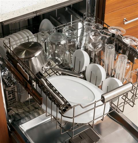 Quickly adjust the upper rack 2 inches up or down to accommodate tall glassware and 101/2" plates with plenty of room in the bottom rack for large platters and cookie sheets
