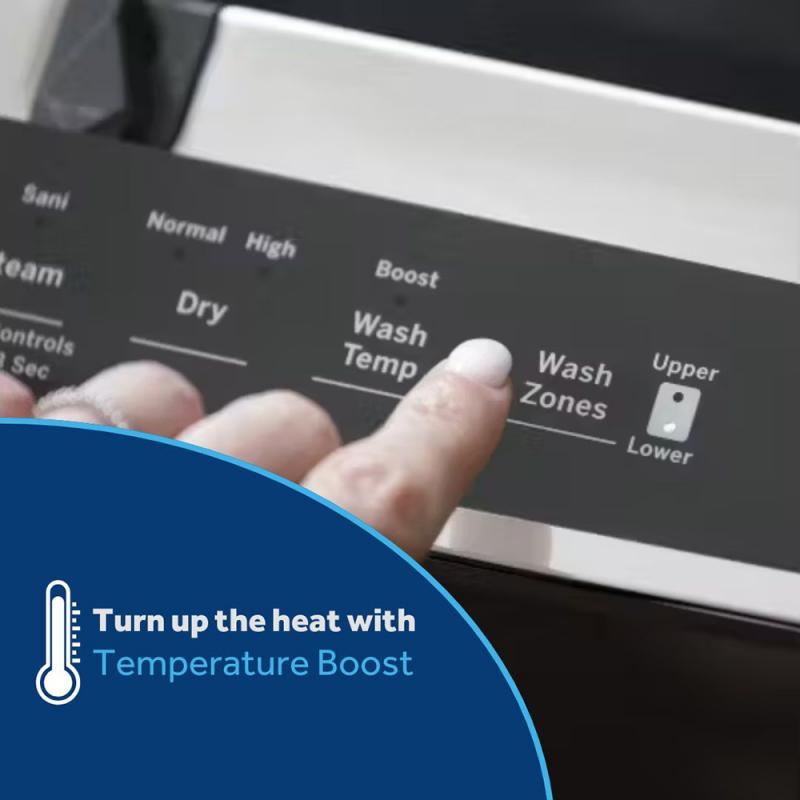 High-temperature rinse sanitizes and reduces by 99.999% the bacteria found on dishes