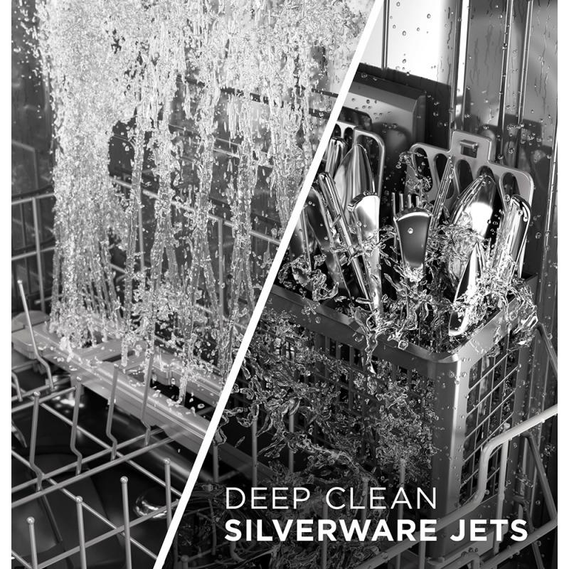 A system of 40 deep-cleaning silverware jets blasts the silverware basket from the bottom up, removing all stuck-on food for sparkling results