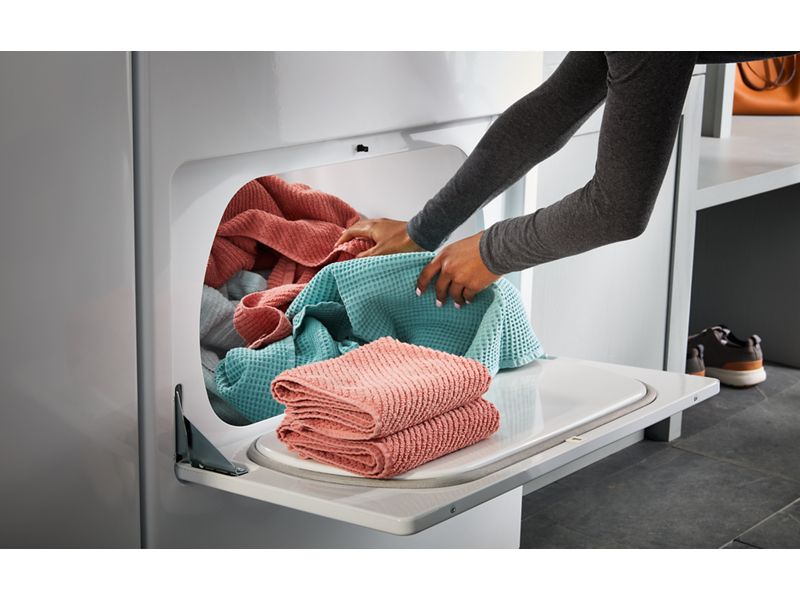Sweep laundry onto the open hamper style door and keep it off the floor. The latch-free door drops down and closes seamlessly, giving you a sturdy platform for unloading, folding and stacking.