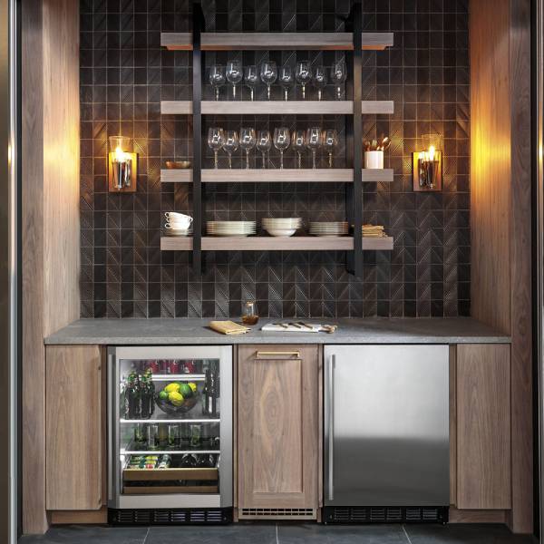 Three removable glass shelves, including a QuickSpace™ shelf, and two full-extension wine racks hold up to 10 wine bottles, as well as 12-ounce cans, quart-size bottles, and two-liter plastic containers.