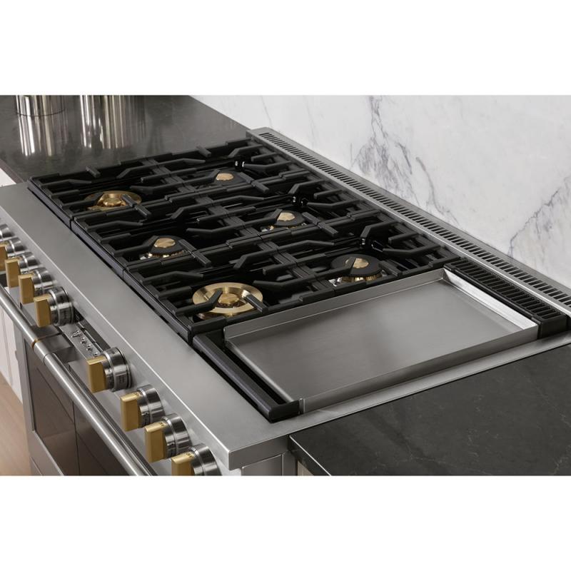 Delivering exceptional cooking flexibility, the two 23,000-BTU multi-ring brass burners and dual-stack burners offer a range of heat settings, from gentle simmer to intense flame