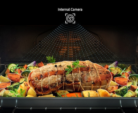* Available on Android and iOS devices. A Wi-Fi connection and a Samsung account are required. ** Camera is located at the top of the oven; view of lower racks may be obstructed. For ingredient recognition, a single ingredient dish should be placed in the center of the oven, unobstructed. Keep camera lens clean. AI recognition accuracy depends on usage conditions; for more detailed information, please refer to the user guide.