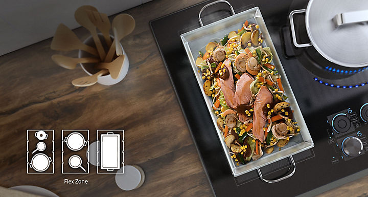 Use your oversized pots and pans to cook without worrying about evenly distributed heat.The FlexCook Zone is a large, open area that offers greater flexibility for cooking multiple dishes, by bridging two left elements to create one large element. It can accommodate different sizes of cookware to cook everything evenly and efficiently without “dead zones”.