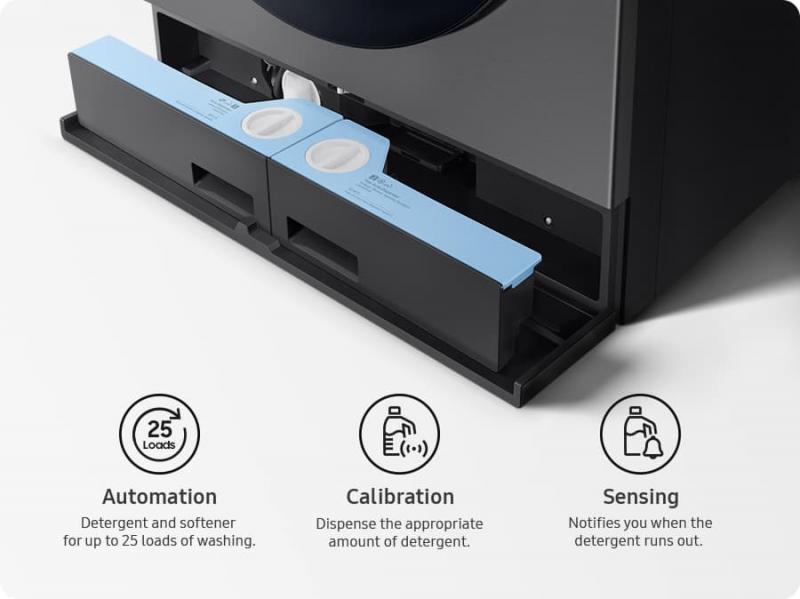 * Available on Android and iOS devices. A Wi-Fi connection and a Samsung account are required. ** Can be applied on Towels, AI Opti Wash & Dry™, Heavy Duty, Super Speed, Small Load cycle only when the selected washing temperature is 'hot'. *** Based on internal testing with IEC 8lb load except for Small Load cycle (IEC 4lb load). Results may vary depending on the actual usage conditions. **** It may reduce the washing performance on an AI Opti Wash & Dry™ cycle with light laundry to support fabric care.