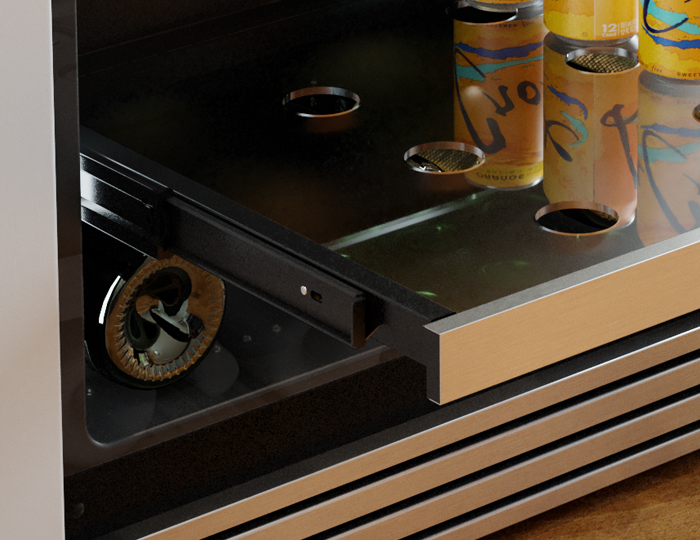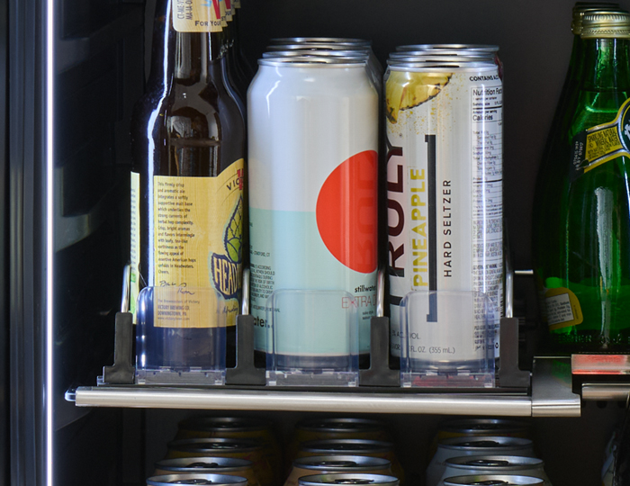 Includes a 3-row spring-loaded drink caddy which pushes drinks forward for quick and easy access