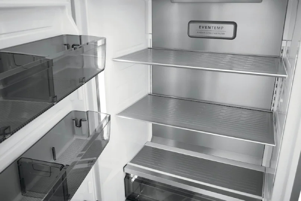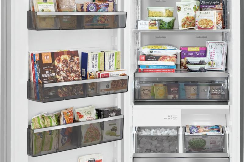 Easily organize your family's favorites with our adjustable smudge-resistant stainless steel (metal) shelving, movable full-width dark tinted door bins with metallic trim, divided bottom drawer, soft freeze drawer, and glide-out ice maker.