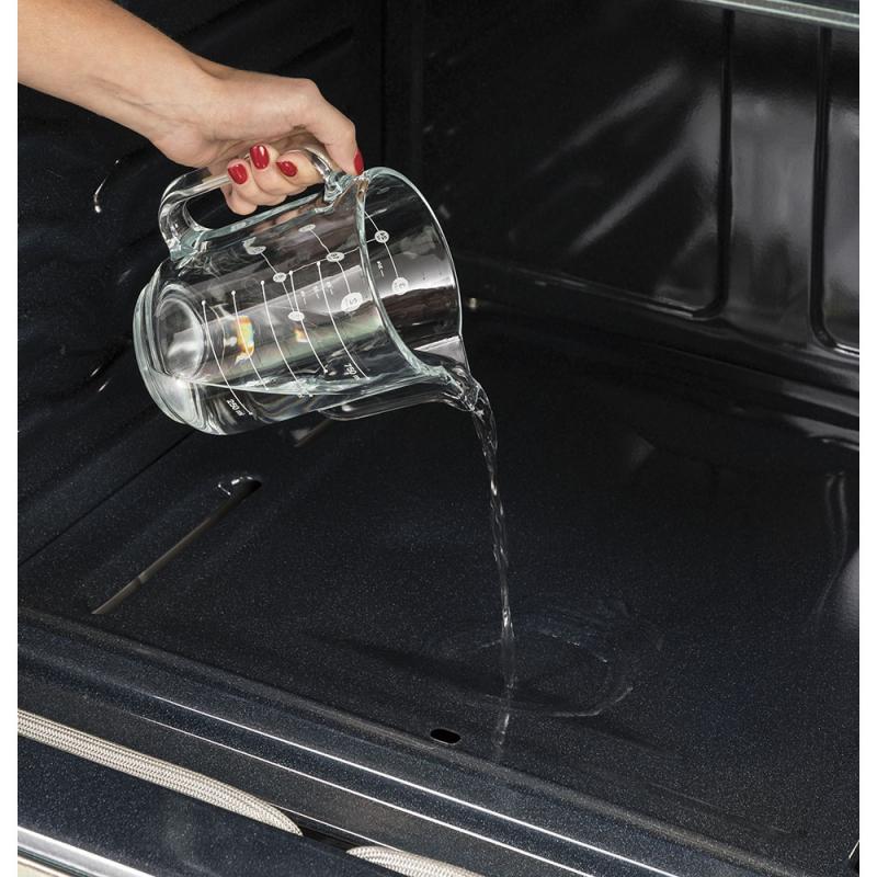 This self-cleaning oven uses optional steam cleaning for light soils to clean the oven cavity in 30 minutes with less heat and odor