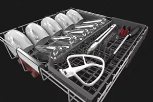 Uses microfiltration to continuously remove food particles during the wash and rinse cycles and circulates clean water to dishes in all three racks. This allows dirty cookware and delicate glassware to be washed together in the same load.