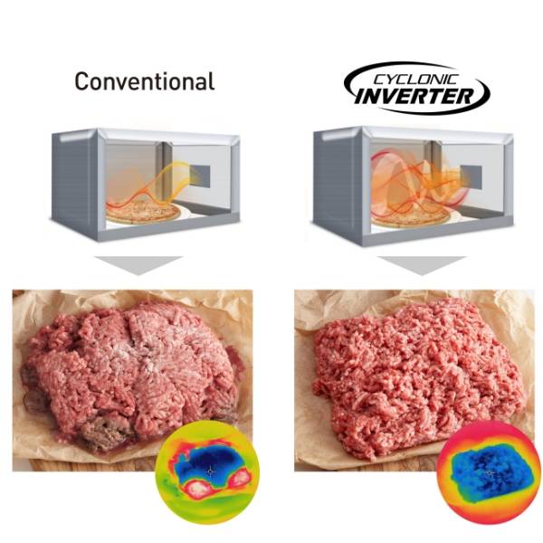 Cyclonic inverter technology takes the consistent heating of inverter technology to a whole new level by circulating heat efficiently throughout the oven to deliver gourmet cooking results in minutes. No more cold spots or overcooked edges, no matter the size of food.