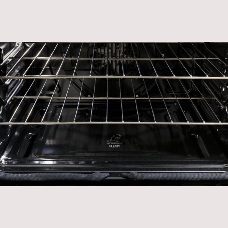 This self-cleaning oven uses optional steam cleaning for light soils to clean the oven cavity with less heat and odor