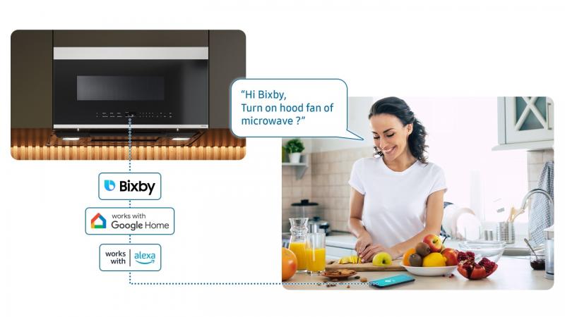 * A Wi-Fi connection and a Samsung Account is required. The remote control functions that are available may differ by model, please refer to the user’s manual. ** Bixby is Samsung’s brand of artificial intelligence (AI) / Internet of Things (IoT) voice assistant. Bixby service availability may vary depending on country. Bixby recognizes selected languages and certain accents/dialects. The user interface may change and differ by device. The availability of Bixby features and content providers may vary depending on the country/carrier/language/device model/OS version. A Samsung account log-in and data network connection (Wi-Fi or data network) are required. *** Amazon, Alexa and all related logos are trademarks of Amazon.Com, Inc. or its affiliates. **** Google is a trademark of Google LLC. ***** The 'Voice Auto Cook' function only supports 10 recipes: Popcorn, Potato, Reheat Pizza, Spinach, Brown Rice, Fresh Fish Fillet, Chicken Nuggets, French Fries, Melt Butter and Soften Cream Cheese.