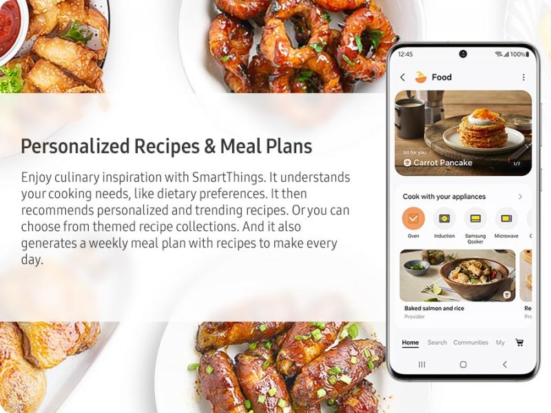 Enjoy a simple and fun way to cook and plan meals using SmartThings Cooking in the SmartThings App*. You can monitor and control the microwave oven's functions and settings. It recommends a cooking mode, suggests personalized recipes and meal plans, enables grocery shopping and offers an interactive experience.