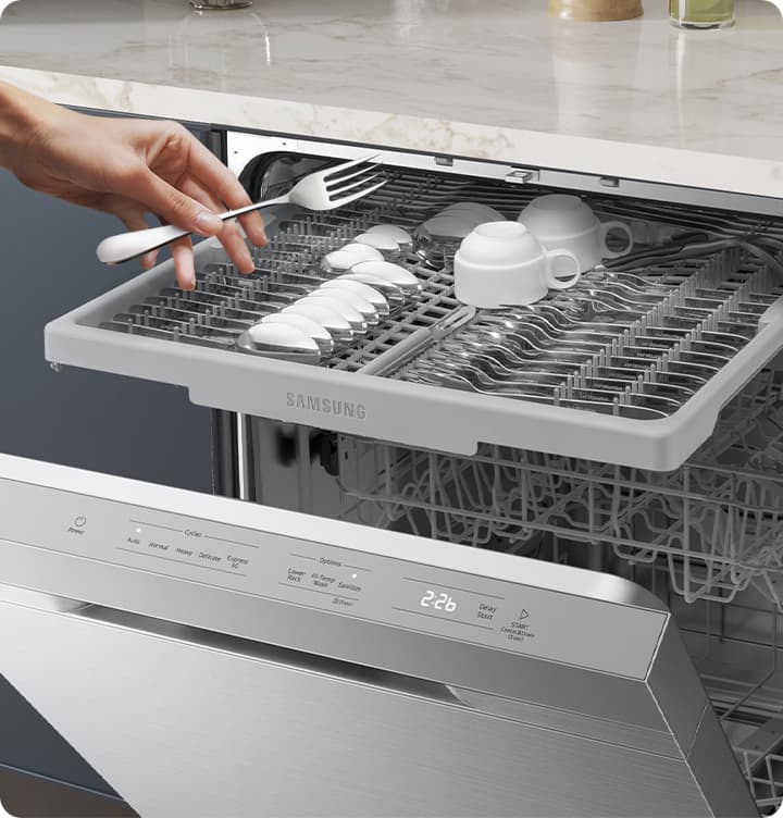 Wash cutlery and large utensils easily with a convenient 3rd Rack at the top. It provides a dedicated area to place your cutlery and cooking utensils. Items can be loaded and unloaded quickly and efficiently. It also frees up space in the rest of the dishwasher* for other items.