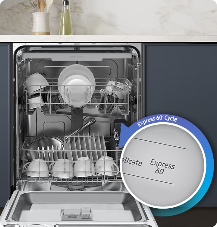 Free up your time by getting dishes clean and dry quickly with the Express 60' cycle. It is ideal for small loads of lightly soiled items that do not need really intensive cleaning, such as cups, cutlery and dinner plates. It does a complete washing and drying cycle within just 60 minutes.