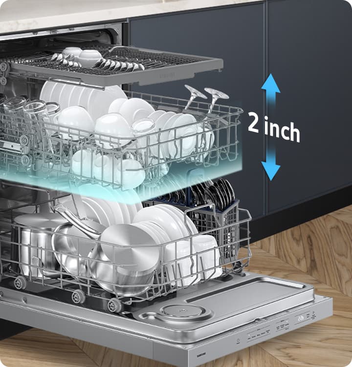 Fit in the many different types of dishes easily. A Height Adjustment feature allows the upper rack to be moved up or down by an extra 2 inches to create extra space in the lower rack. So it can accommodate various sizes and shapes of dishes, including tall pots, wide platters and large plates.