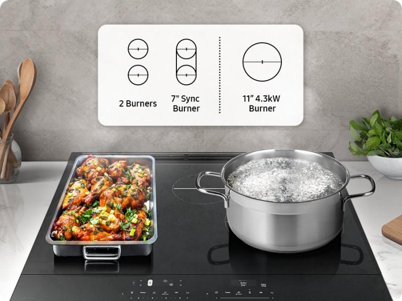 Cook a variety of dishes quickly and flexibly. The powerful heat of a 4.3kW Induction Cooktop is ideal for sautéing and searing meat, boiling water in a flash and cooking food rapidly. A 7” Sync Burner also lets you control two burners with one control, so they act as one large cooking zone.