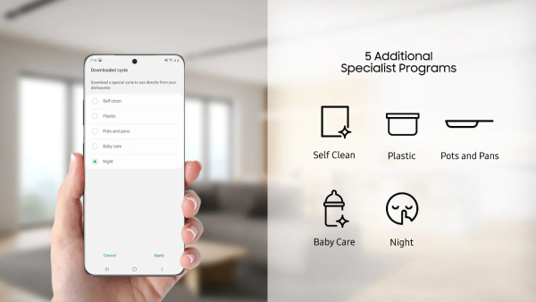 Customize your cleaning experience whenever you want using the SmartThings App.* The Download Cycles option lets you choose from 5 separate cleaning options and download the one you want. Simply select the “Night”, “Self Clean”, “Pots and Pans”, “Plastic”or “Baby Care” cycle.
