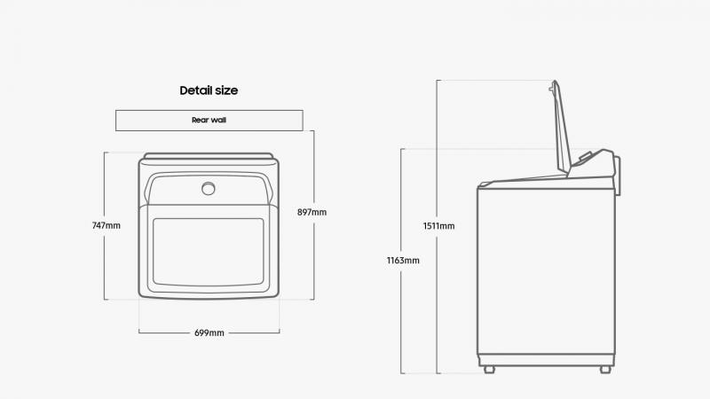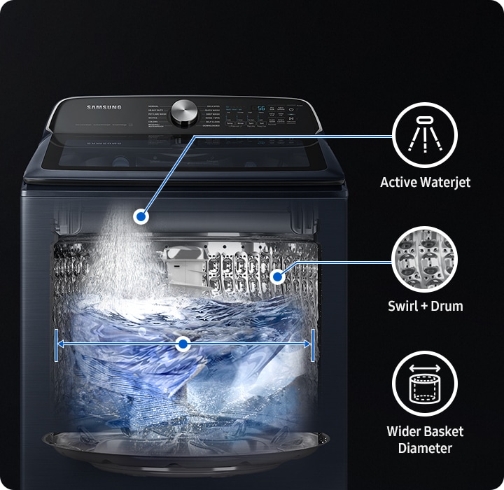 * As compared to Samsung model WA7700A. Based on internal testing on a 8 lb load containing 1 g of dog hair. The WA7700A using a Normal cycle removed 4% of pet hairs and the WA7150C using the Pet Care Wash cycle and Pet Hair Filter removed 24% of pet hairs. ** Based on internal testing of the rinsing ratio, which measures the water’s electrical conductivity to assess the amount of detergent remaining before and after rinsing. The rinsing ratio using the Pet Care Wash is 1.05 compared to 0.402 with a Normal cycle, which is a 2.6 times better rinsing performance. *** Tested by Hanyang University based on Samsung internal protocols. Results provided to and interpreted by Intertek and Witness Report provided on April 18th 2023. Tested using IEC A* detergent and an IEC 8 lb load containing a 10x10cm fabric specimen polluted with hair, dead skin and dust from dogs and cats. Result: removed 99% or more of the dog/cat allergens tested. Dog allergens (Can f 1) had an average input of 462.0 ± 41 ng/mL and an average output of 2.6 ± 1.5 ng/mL. Cat allergens (Fel d 1) had an average input of 67.2 ± 3.7 ng/mL and an average output of 0.2 ng/mL or less. Results may vary depending on actual usage conditions.