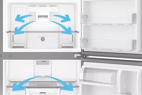 With Total Coverage Cooling, multi-flow vents direct fresh, chilled air throughout the refrigerator to help keep an even temperature at every shelf.